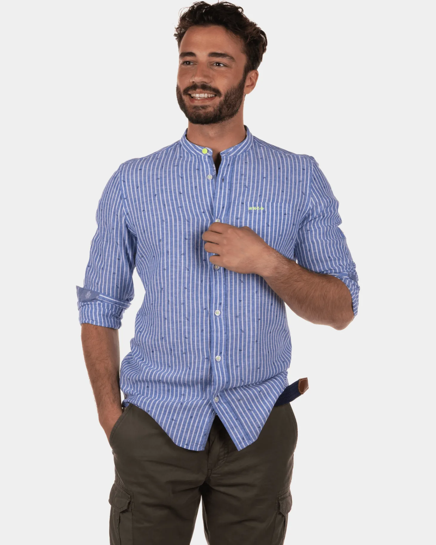 Rotonuiaha gestreiftes Leinenhemd ohne Kragen – Chinese Blue