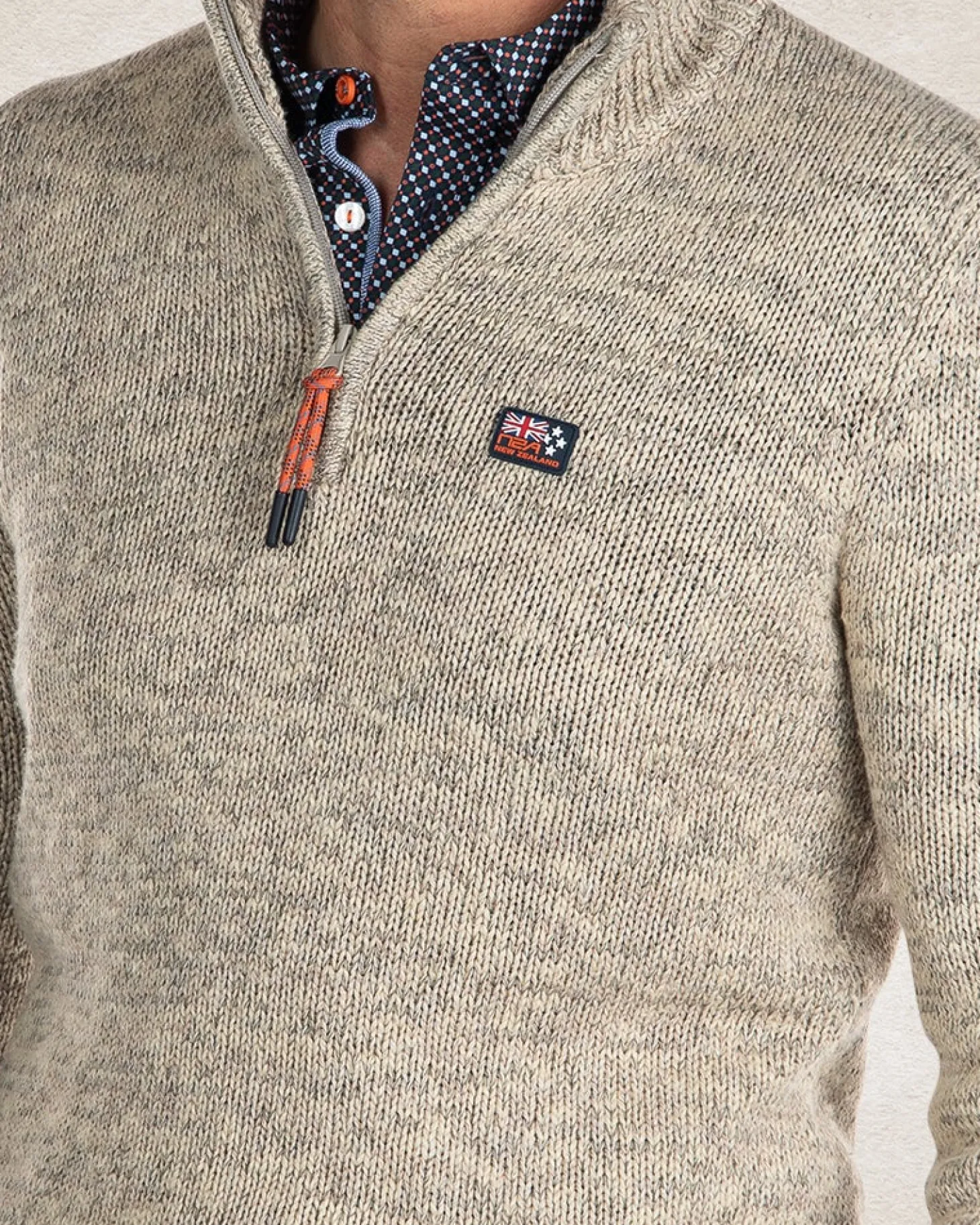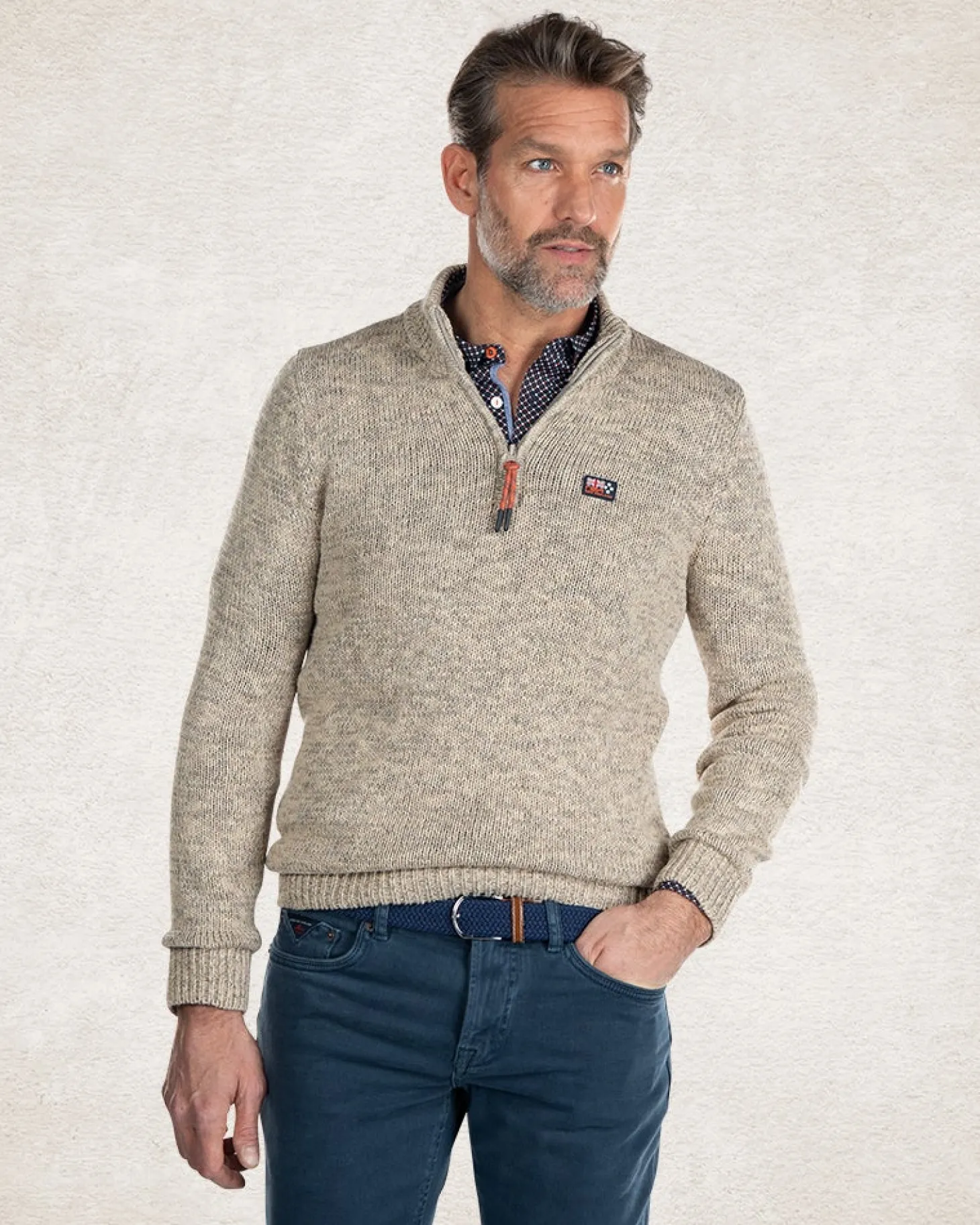 Beigefarbener Baumwollpullover mit halbem Reißverschluss – Sahara Sand