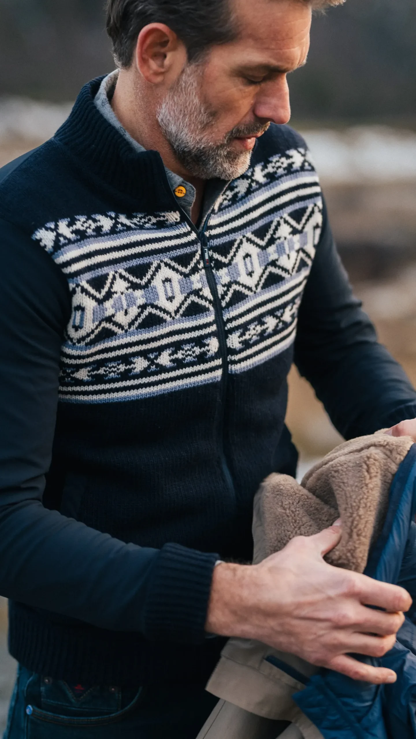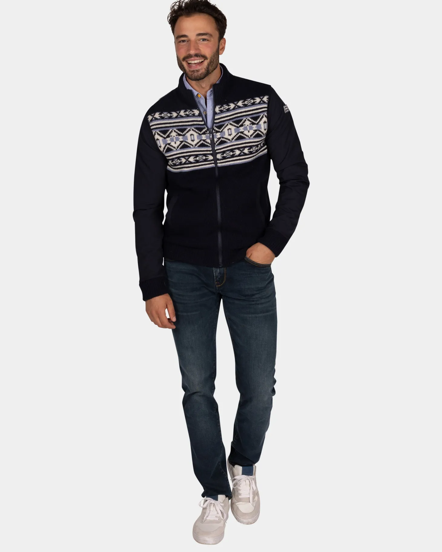 Dunkelblaue Strickjacke mit weiß-blauem Muster – Winter Navy