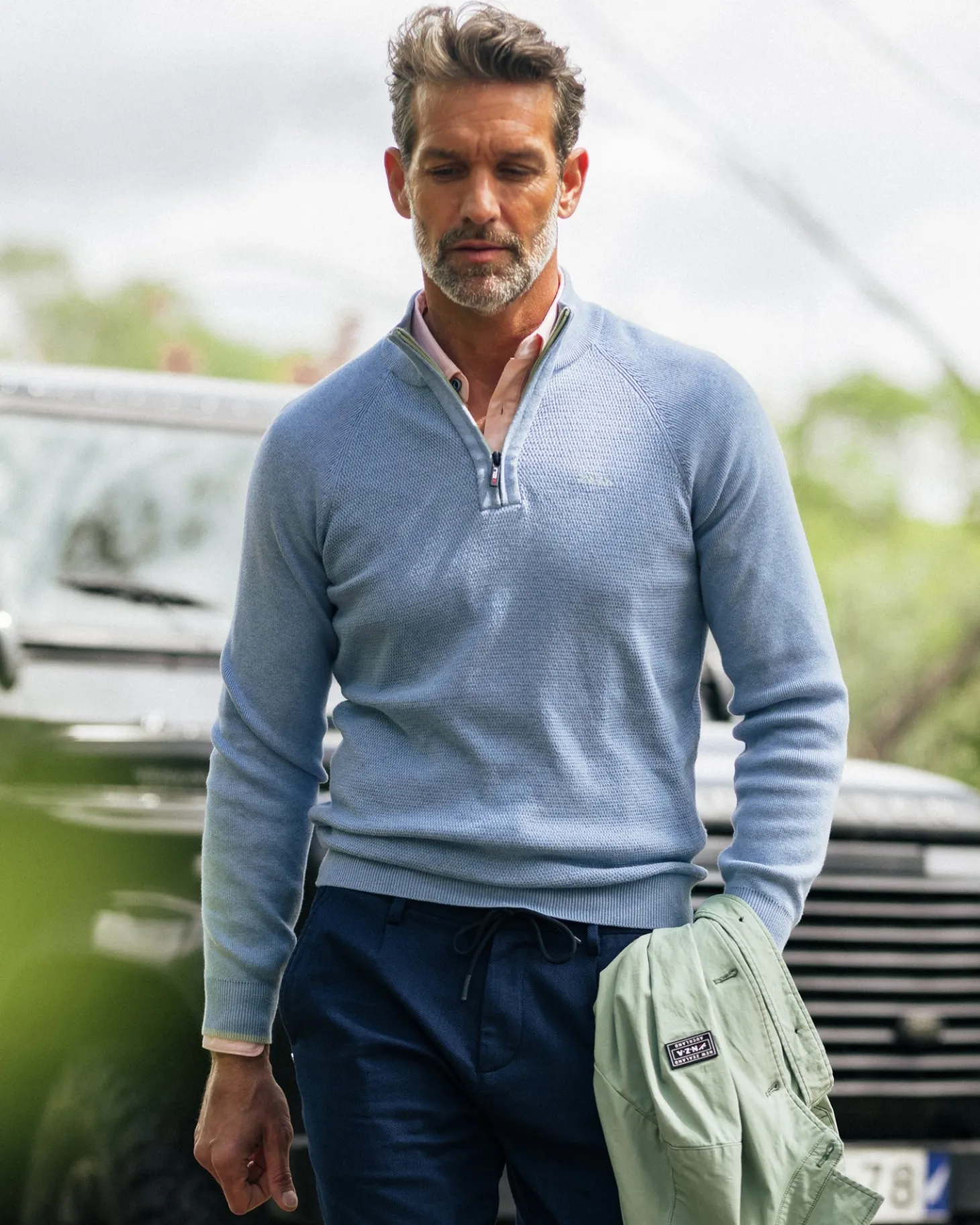 Einfarbiger hellblauer Baumwollpullover mit halbem Reißverschluss