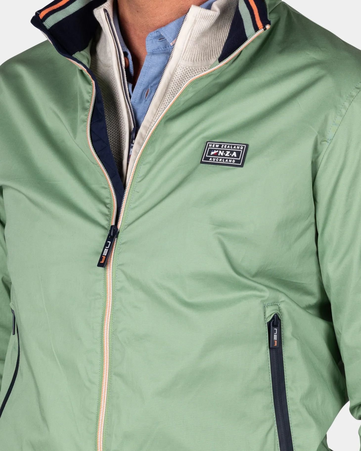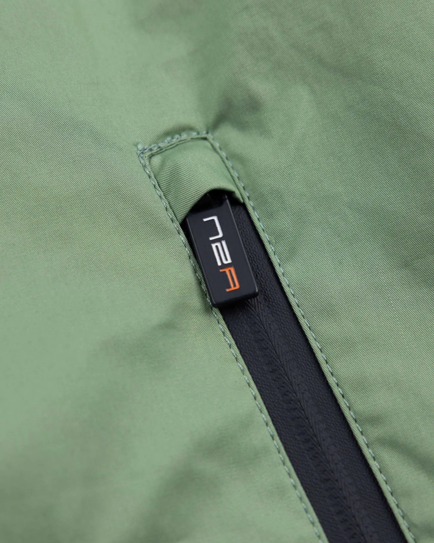 - Akzentfarbige Paspeln an den Bündchen, am unteren Saum und im Inneren des Kragens