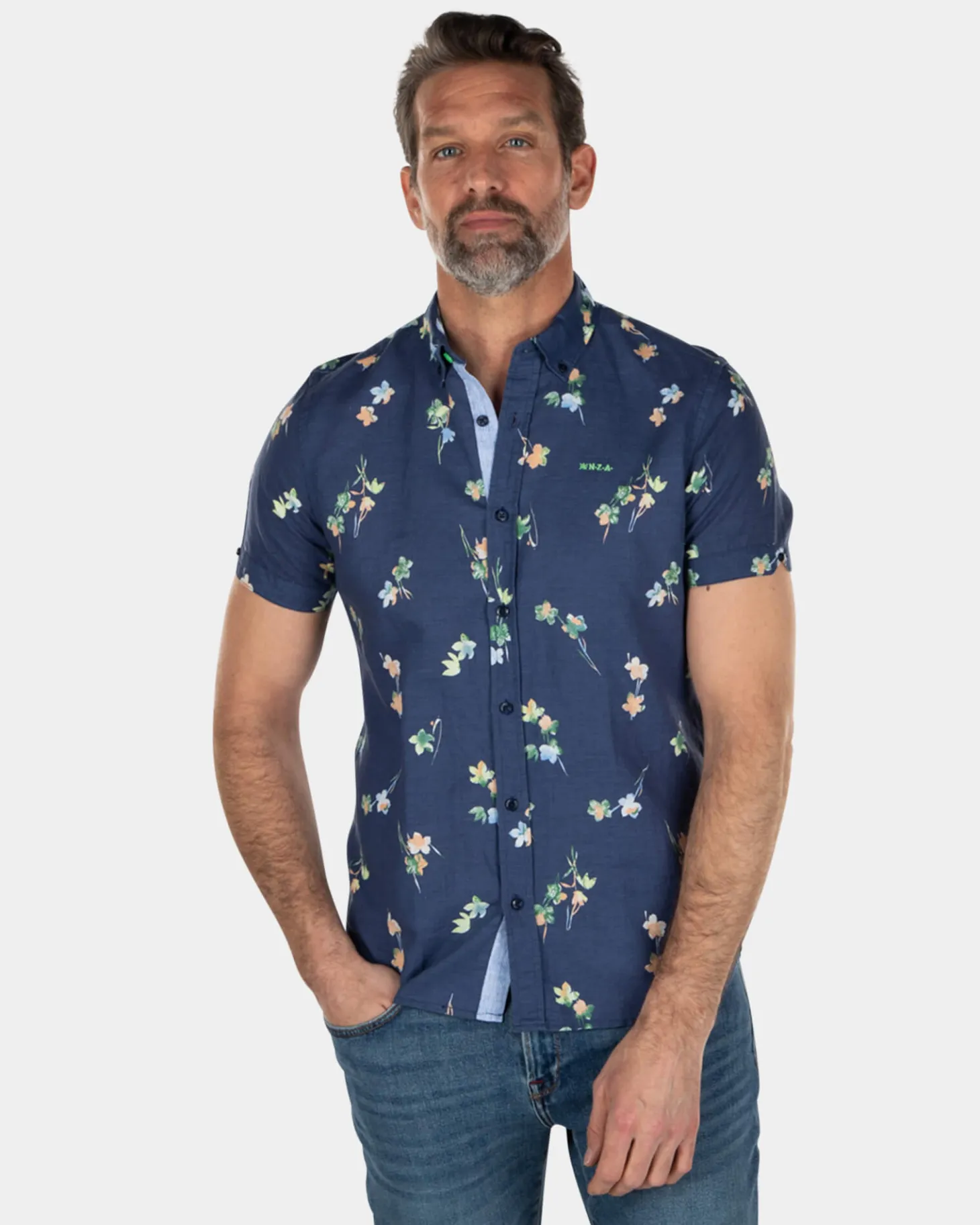 Kurzärmliges Leinen-Baumwollhemd mit Blumendruck – Key Navy