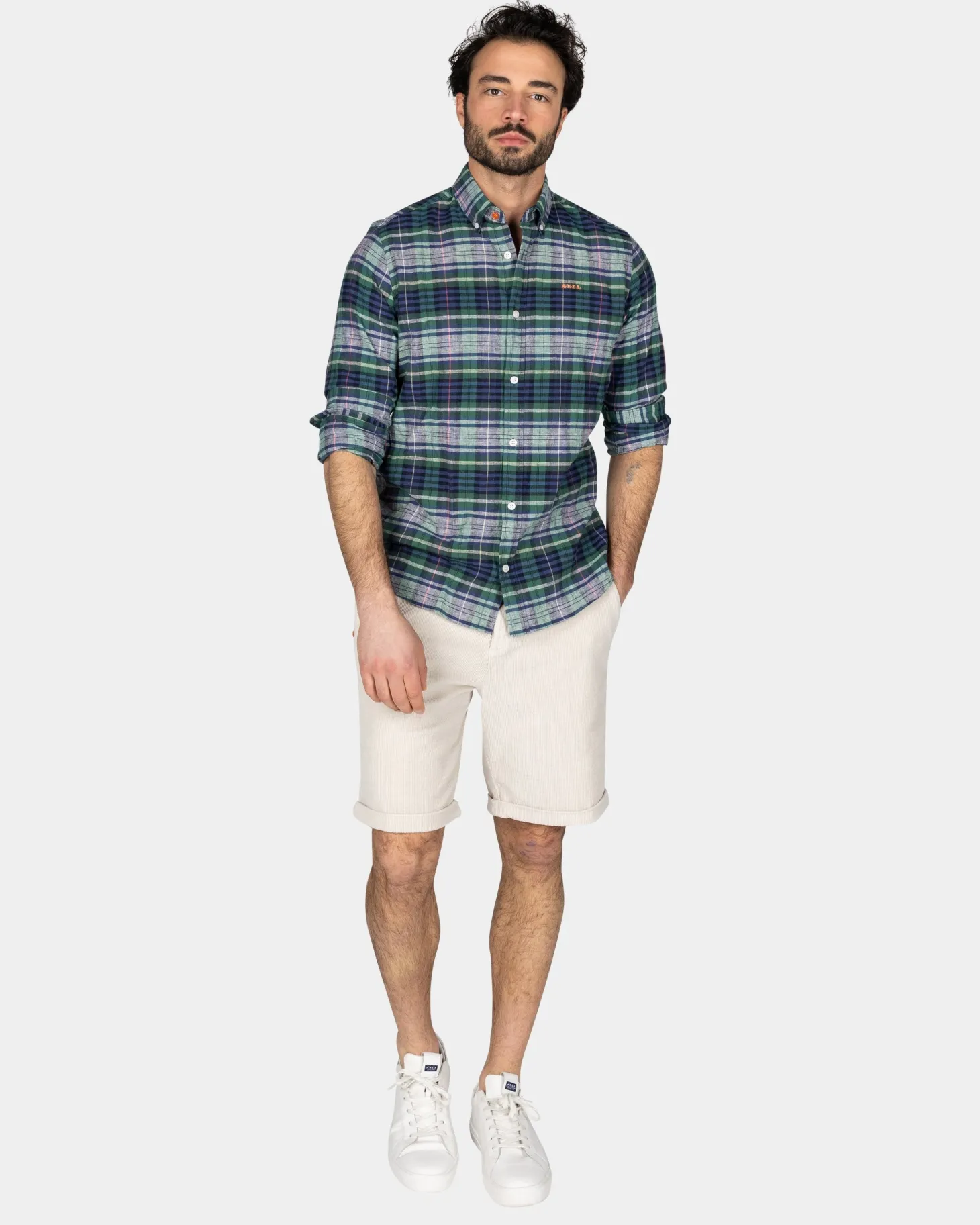 - Button-Down-Kragen mit akzentfarbenem Knopf oben
