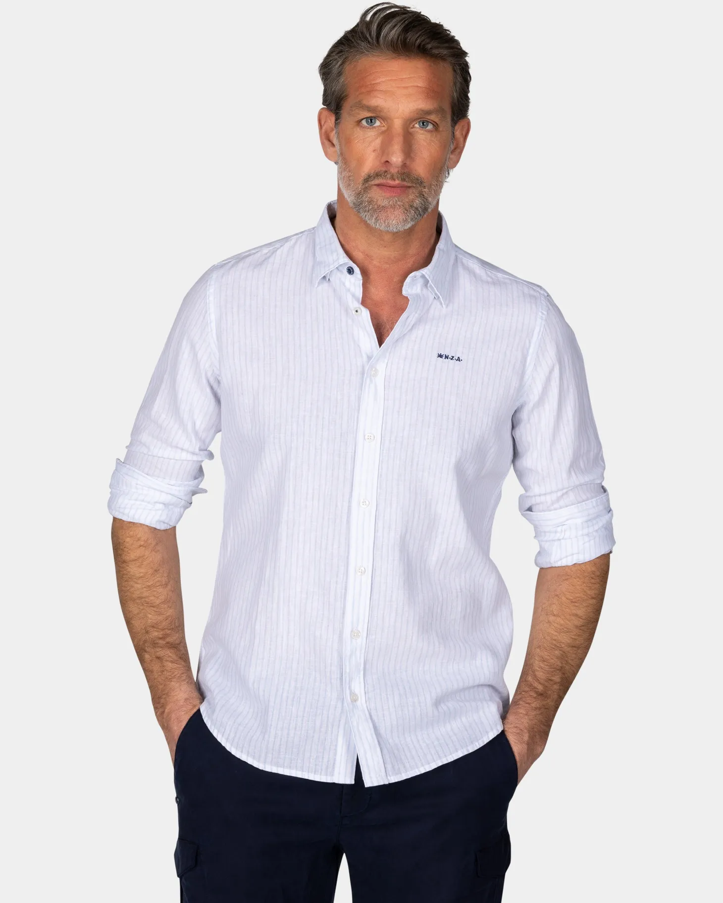 Weißes Leinenhemd mit pastellblauem Streifen